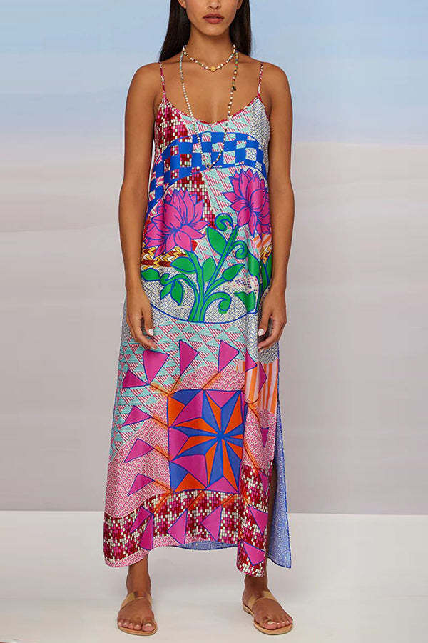 Vacation Forever Satin Funny Holiday Print Cami Slit Maxi Dress